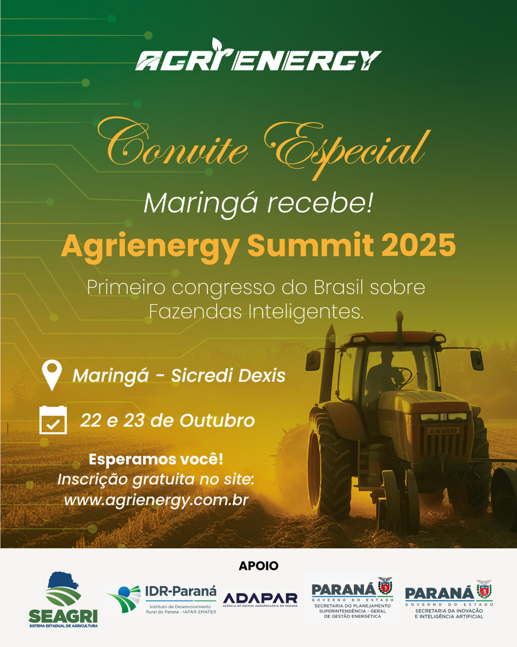 Nos dias 22 e 23 de outubro de 2025, Maringá será palco da segunda edição paranaense do Agrienergy Summit, o 1º Congresso Nacional de Fazendas Inteligentes, que conecta agricultura, energia renovável, tecnologia, conectividade e sustentabilidade. O evento se configura como uma plataforma estratégica para fomentar políticas públicas, atrair investimentos e promover a integração entre o setor produtivo, academia e governo, alinhando-se diretamente com os programas estaduais de modernização do agro, como o RenovaPR e o Irriga Paraná.
